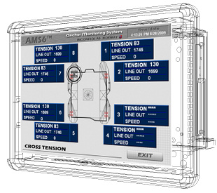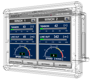 Our Human Machine Interface application developed for the local Allan Bradley monitoring operator displays is optimized for the best look-and-feel results: visualization, design and user friendlyness. The standard AMS6 system includes one operator display unit per mooring location – typically four anchor winch cabins, but if it is required, supplementary units can be added.