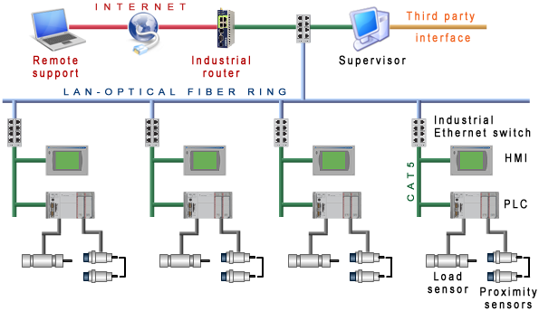 Using industrial Ethernet switches connected through an optical fiber layer in a ring topology, communication network architecture between AMS6 devices at different levels has been designed to achieve maximum speed performance and node redundancy at the same time.